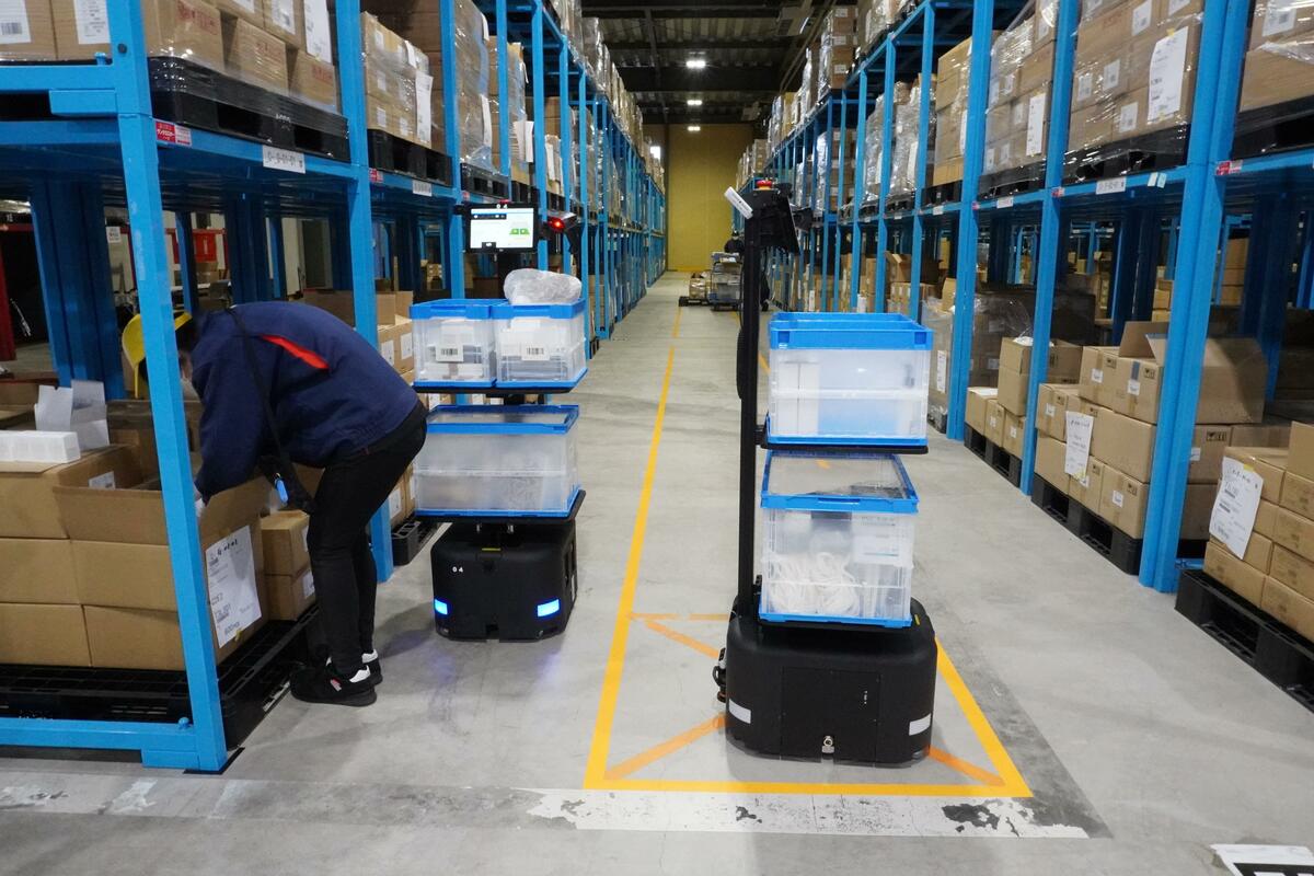 - 作業員は、手ぶらでAMRの場所まで移動し、商品を棚からピックし、AMRに乗せます。
