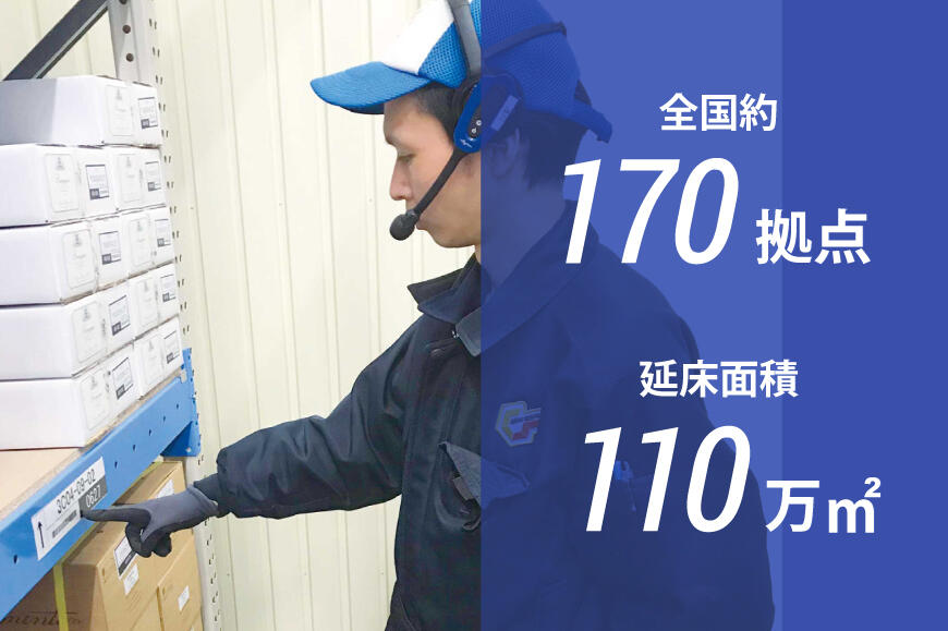 日本国内で約170拠点、延べ床面積110万㎡の物流拠点ネットワークを展開しています。物流センターでは保管や配送だけでなく、輸出梱包やラベル貼付、詰め合わせ作業など、さまざまな流通加工にも対応しています。何万種にも及ぶ自動車部品から、厳しい衛生管理と正確なロット管理が問われる食品や医療機器まであらゆる製品に対応し、作業品質・管理品質ともに高いレベルで実現しています。